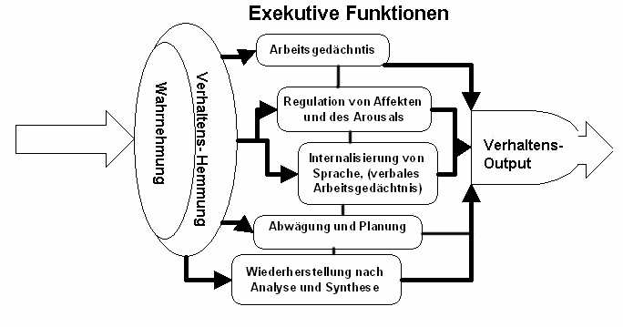 Exekutive Funktionen umfassen die bewusstseinsnahe Steuerung und Zielüberwachung komplexer, nicht automatisierter Verhaltensweisen, bei denen es gilt, mehrere kognitive Aspekte zu koordinieren. Hierzu gehören Bereiche wie Aufmerksamkeitsfokussierung, Arbeitsgedächtnis, Inhibition (unterbinden/Hemmung), Aufgabenmanagement, Planen, Monitoring und Kodierung von Informationen.